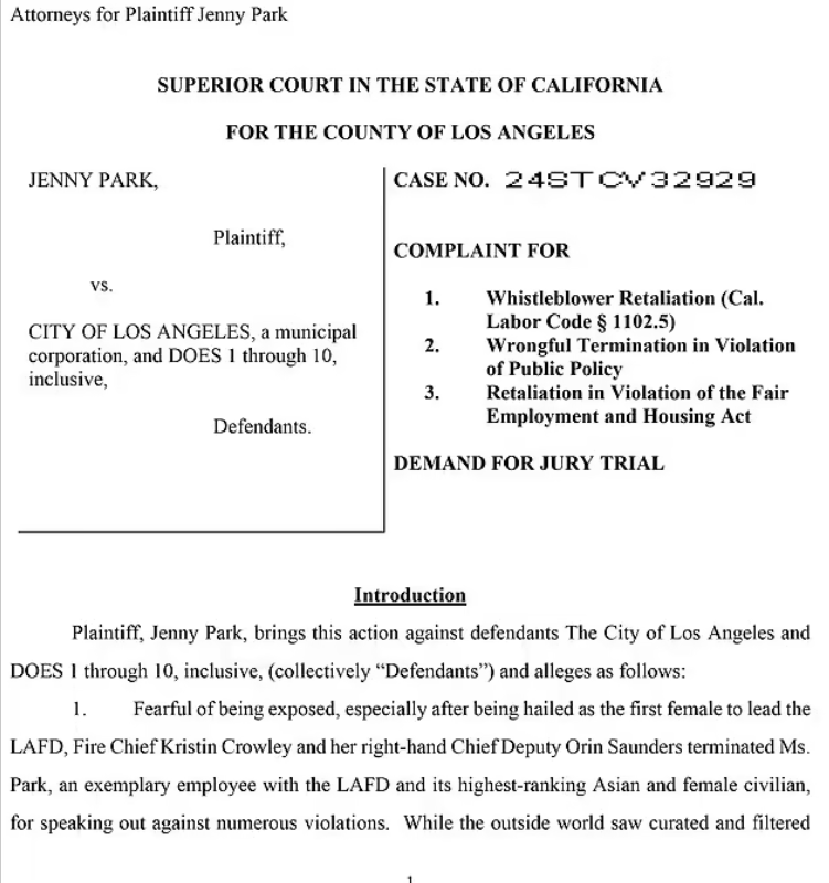 한인으로 추정되는 아시안 여성, 전 LA소방국 행정관 제니 박은 산불이나기 일주일전 크라울리 국장과 오린 손더스 부국장을 상대로 소송을 제기했다. 소장에 따르면 박 전 행정관은 크라울리 국장의 3만 7천 달러 급여 과지급 문제와 부서 내 계약 관련 문제점을 지적했다가 부당하게 해고당했다고 주장했다.