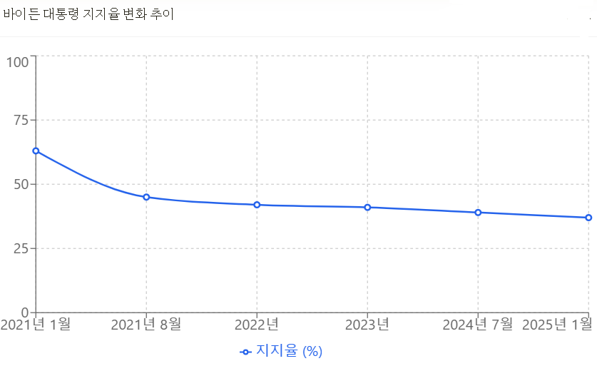 4년 전 바이든 대통령 취임 당시만 해도 대다수의 미국인들은 새 정부에 대해 낙관적이었다. 코로나19 팬데믹 통제에 대한 기대감으로 60%대의 높은 지지율을 기록했다. 하지만 이는 오래가지 못했다. 2021년 여름 아프가니스탄에서의 혼란스러운 미군 철수 이후 지지율이 하락하기 시작했고, 그해 가을 인플레이션 우려가 커지면서 더욱 급락했다. 이후 지지율은 회복되지 못했다.