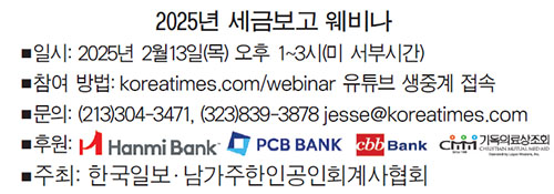 2025년 세금보고 시즌을 대비해 한국일보 미주본사와 남가주한인공인회계사협회(KACPA)가 공동 주최하는 제36회 ‘세금보고 세미나’가 오는 2월 13일(목) 오후 1시(미 서부시간) 웨비나 형식으로 미 전역 한인들을 대상으로 열립니다.
