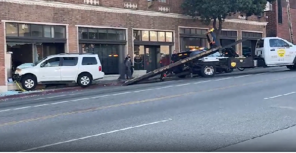 LOS ANGELES – In what locals initially mistook for another Hollywood film shoot, a white Nissan Armada decided to create its own drive-through entrance at a storefront near the intersection of Normandie Avenue and 6th Street in Koreatown on February 1, 2025, at approximately 2:28 PM.