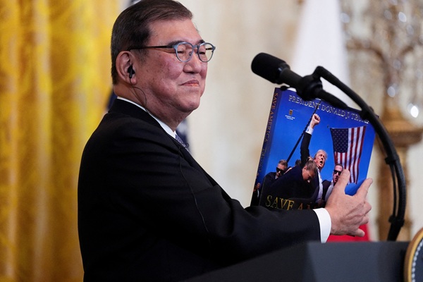 이시바 총리는 이번 회담에서 트럼프 대통령이 지난해 7월 유세 도중 총격으로 귀를 다쳤을 때 찍힌 사진을 언급하면서 “역사에 남을 한 장. (도널드) 대통령은 그때 ‘내가 신으로부터 선택받았다’고 확신했던 것이 틀림없다”고 말했다.