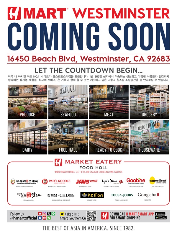 H마트는 웨스트민스터점은 다양한 문화의 식료품, 주류, 생활용품을 비롯해 푸드홀까지 갖춘 원스톱 쇼핑 매장으로 지역 주민들에게 편리한 쇼핑 경험을 제공할 예정입니다.