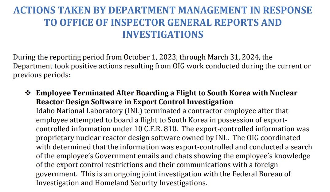 17일 에너지부 감사관실이 미국 의회에 제출한 반기보고서에 따르면 아이다호 국립연구소(INL)의 도급업체 직원이 수출통제 대상에 해당하는 정보를 소지한 채 한국으로 향하는 항공기에 탑승하려고 했다가 적발돼 해고된 사건이 발생했다.