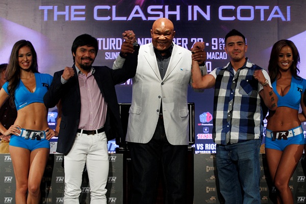 FILE PHOTO: FILE PHOTO: Filipino boxer Manny Pacquiao (2nd L), former heavyweight champion George Foreman (C) of the U.S., and compatriot Brandon Rios (2nd R) pose after a news conference at the Venetian Macao hotel in Macau July 27, 2013. REUTERS/Tyrone Siu (CHINA - Tags: SPORT BOXING)/File Photo