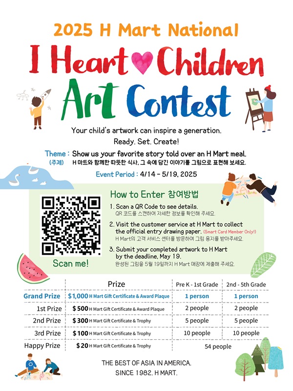 이번 대회는 오는 4월 14일부터 5월 19일까지 약 한 달간 진행되며, Pre-K부터 초등학교 5학년까지의 H마트 스마트카드 회원 자녀들이 참가할 수 있습니다.