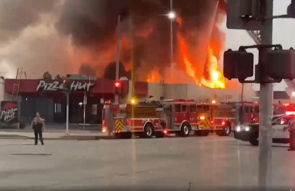 피자헛 건물 전소, 인근 건물로 화재 급속 확산 중