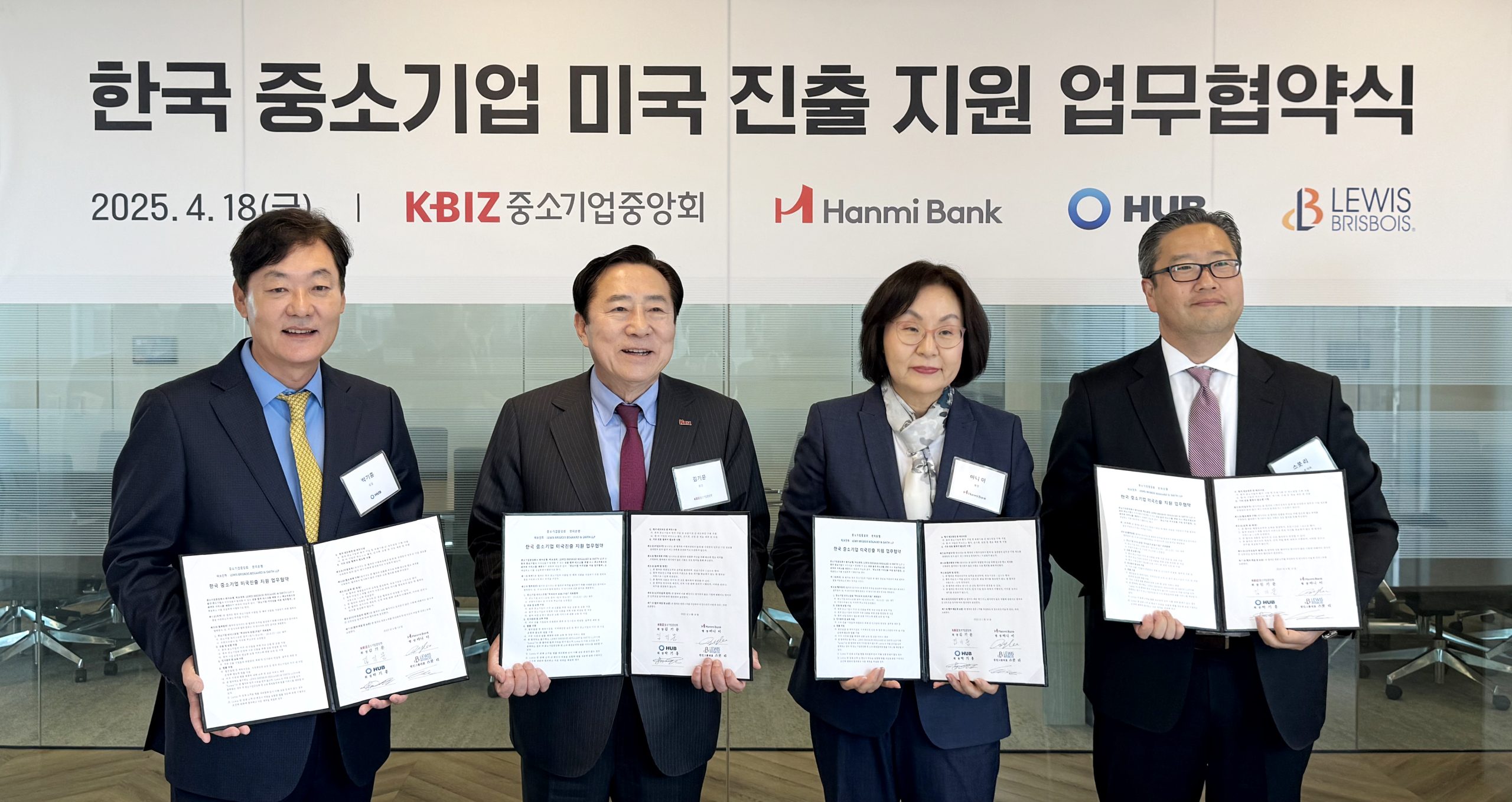 한미 은행은 지난 18 일 본사 사무실에서 한국 중소기업 중앙회, 보험사 허브 천하, 로펌 LBBS 와 함께 한국 중소기업의 수출입 및 미국 시장 진출 지원을 위한 업무협약을 체결했습니다. .