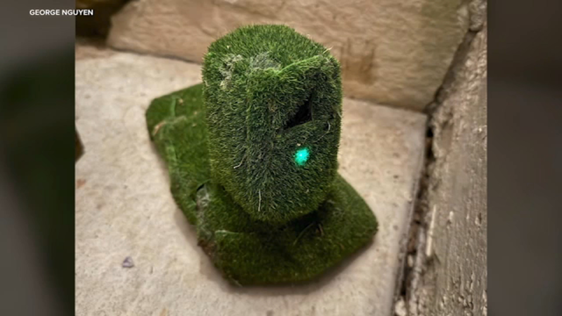 몰래 카메라는 가짜 잔디로 포장돼 수풀속에 숨겨져 있었으며 집 정문을 정면으로 향하고 있었습니다.
