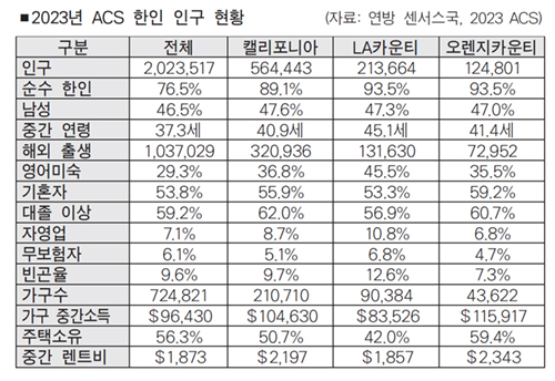 2023년 ACS 기준 한인 인구는 주별로 캘리포니아에 약 56만 명(29%)으로 가장 많았고, 이어 뉴욕 14만명, 텍사스 11만명, 뉴저지 10.5만명, 버지니아 9만명 등의 순이었다. 메트로 지역 별로는 LA·OC 메트로 지역이 약 34만 명으로 최다였다.