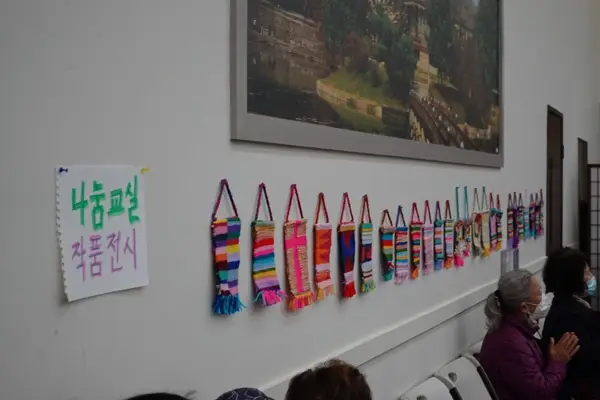 신영신 이사장은 “오늘은 어머니의 날이기도 하지만, 발달장애 자녀를 둔 어머니들을 생각하는 날이기도 하다”고 말하며, 발달장애인 수업을 8년째 이어오고 있는 시니어센터의 성과를 전했습니다. 이날 행사에서는 발달장애 참가자들이 만든 가방과 그림 등이 벽에 전시됐습니다.