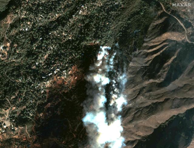 캘리포니아주 로스엔젤레스 말리부 북부의 산타모니카산 일대가 10일 닷새째 이어진 화재로 불타고 있다. 미국 민간 인공위성 기업 막사 테크놀로지가 공개한 사진이다. AFP 연합뉴스