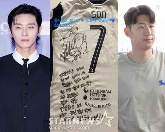 30일(한국시간) 박서준은 개인 SNS에 “동시대를 살아갈 수 있음에 영광이야”라며 손흥민에게 받은 사인 유니폼 사진을 게재했다.