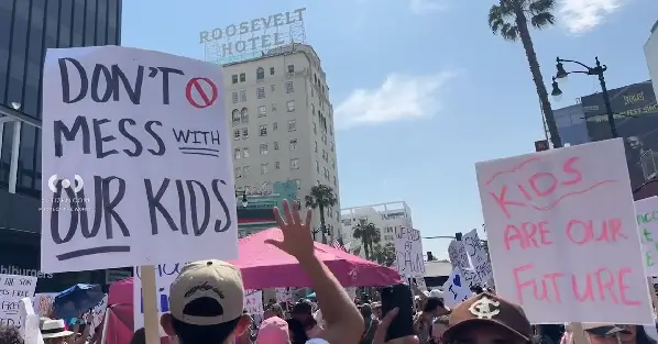 31일(현지시간) 미국 로스앤젤레스 할리우드 대로(6801 Hollywood Blvd)에서 수십 명의 시민들이 자녀 보호와 관련된 메시지를 들고 시위를 벌였다. 시위 참가자들은 “DON’T MESS WITH OUR KIDS(우리 아이들을 건드리지 마라)”, “KIDS ARE OUR FUTURE(아이들은 우리의 미래)” 등 문구가 적힌 팻말을 들고 행진하며 아이들의 권리와 미래를 지켜야 한다고 목소리를 높였다.