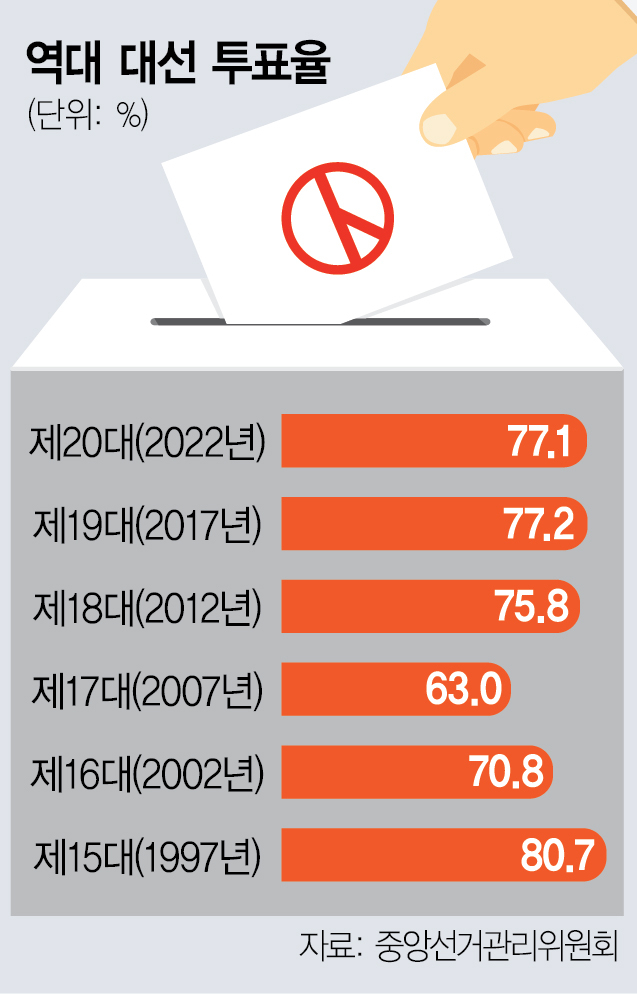 ②과반 당선=새 대통령이 50% 득표를 얻을지 여부도 관심사다. 직선제 이후 50%의 유권자 지지를 얻어 집권에 성공한 것은 2012년 박근혜 전 대통령 당선이 유일하다. 득표율은 단순한 숫자를 넘어 차후 정국 운영에도 영향을 끼친다. 과반 득표는 곧 압도적 승리로, 새 정권의 각종 의사 결정에 힘이 실리며 2026년 6월 지방선거 전까지 정국 주도권을 쥘 동력을 확보하게 된다.
