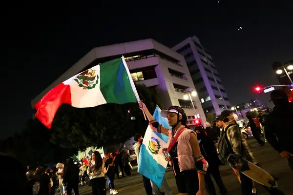 Demonstrators hold Mexican and Guatemalan flags during a protest against federal immigration sweeps, in downtown Los Angeles, California, U.S. June 9, 2025. REUTERS/Aude Guerrucci REFILE - CORRECTING FROM "FEDERAL IMMIGRATION" TO "FEDERAL IMMIGRATION SWEEPS".