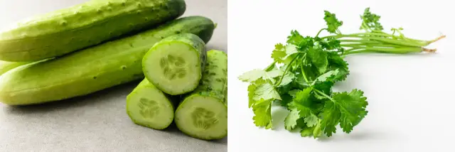 호불호가 갈리지만 오이는 섭취 시 수분과 비타민을 공급해주는 알카리성 식품이다. 또한 오이는 칼륨의 함량이 높아 체내 노폐물을 밖으로 내보내는 역할을 한다. 고수에도 영양소가 풍부하다. 고수는 마그네슘, 칼슘, 인, 칼륨, 비타민 A, B, C, K 등을 함유하고 있는 것으로 알려졌다.