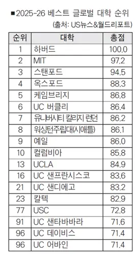 US 뉴스&월드리포트가 지난 17일 발표한 2025-2026 글로벌 최우수 대학(2025-2026 Best Global Universities) 순위에서 이들 미국 3대 대학이 상위 1~3위에 오른 가운데, 영국의 전통 명문 옥스포드대와 케임브리지대가 각각 4위와 5위로 뒤를 이었다.