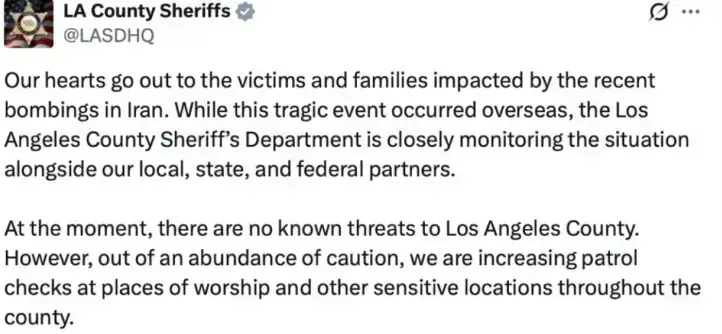 엘에이 카운티 쉐리프국은 미국이 이란의 핵시설을 폭격한 이후 지난 22일 일요일에 x에 실린 글에서 최근 이란에서 발생한 폭격으로 피해를 입은 피해자와 가족들에 대해 애도한다며, 이 비극적인 사건에 대해 카운티 쉐리프국은 상황을 면밀히 모니터링중이라고 밝혔습니다