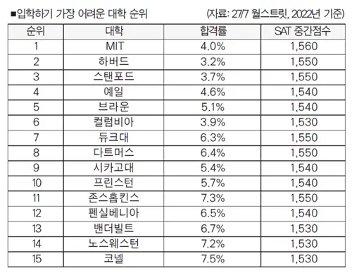 미국에서 가장 입학하기 어려운 대학 1위는 MIT로 나타났다. 경제매체 ‘24/7 월스트릿’이 최근 발표한 입학하기 어려운 미국 대학 순위에서 MIT가 1위에 올랐다. 이 매체는 지난 2022년 가을학기 신입생 기준 합격률 및 SAT 중간 점수 등을 기준으로 입학하기 가장 어려운 대학 상위 50곳을 조사했는데 1위 MIT, 2위 하버드, 3위 스탠포드 등의 순으로 평가됐다.
