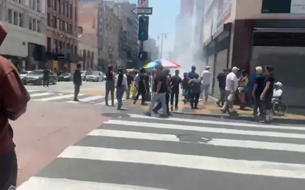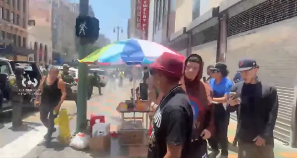 2025년 6월 27일 오후, 미국 로스앤젤레스(LA) 도심 W 6번가와 S 브로드웨이 인근에서 이민세관단속국(ICE) 요원들이 한 여성을 체포하려는 과정에서 이를 저지하려는 시민들이 몰려들었습니다.