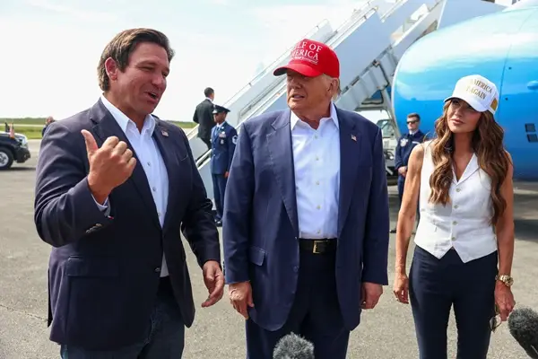 U.S. President Donald Trump, Florida Governor Ron DeSantis and U.S. Homeland Security Secretary Kristi Noem speak with the media at the Dade-Collier Training and Transition Airport on the day of the opening of a temporary migrant detention center informally known as "Alligator Alcatraz" in Ochopee, Florida, U.S., July 1, 2025. REUTERS/Evelyn Hockstein