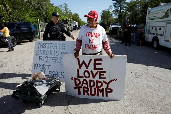 Protester Bob Kunst holds a placard, as he demonstrates at the entrance road of a temporary migrant detention center, informally known as “Alligator Alcatraz”, on the day U.S. President Donald Trump visits the center in Ochopee, Florida, U.S., July 1, 2025. REUTERS/Octavio Jones