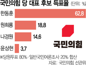 ‘정치 신인’ 한동훈 신임 국민의힘 당대표가 굵직한 정치경력을 지닌 경쟁자들의 집중견제를 뚫고서 결선투표 없이 단판승을 거둔 것은 안정보다 변화를 원하는 당심이 반영된 결과로 풀이된다. 다만