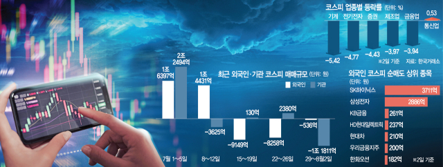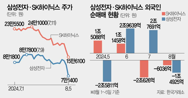 인공지능(AI) 산업 발전 기대감에 힘입어 증시 상승을 이끌어온 반도체주들이 추풍낙엽처럼 무너져 내렸다. 국내 시가총액 1·2위 기업인 삼성전자(005930)와 SK하이닉스(000660)는 10%대 곤두박질쳤다. 지난달 2분기 사상 최대 실적을 발표했음에도 불구하고