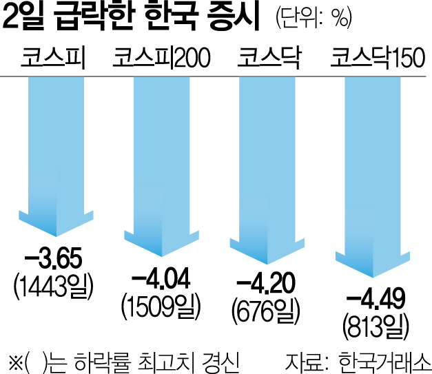 코스피지수가 미국 증시 급락의 직격탄을 맞고 3년 11개월여 만에 가장 큰 낙폭을 기록했다. 전날 밤 미국의 고용지표가 부진한 것으로 나오자 외국인이 현·선물 시장을 통틀어 총