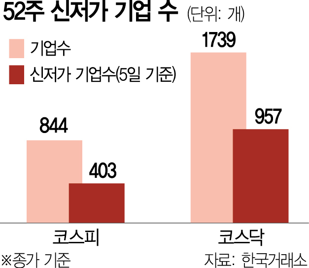 코스피지수와 코스닥지수가 5일 사상 최대치의 하락 폭 기록을 갈아치우면서 유가증권시장에서 403개, 코스닥시장에서 957개 종목이 무더기로 52주 신저가(종가 기준)를 썼다. 장중 52주 신저가를 찍은 상장사는 1437개로