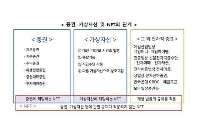 국내 금융당국이 대체불가토큰(NFT)의 가상자산 판단 가이드라인을 내놨다. 대량·대규모로 발행하거나 지급 수단으로 사용되는 NFT는 가상자산에 해당한다. 반면 티켓 형태나 2차 거래를 할 수 없는 NFT는 가상자산에