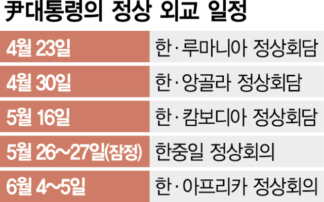 윤석열 대통령이 총선 패배 이후 한 달가량 인적 쇄신과 소통 행보로 일정이 쏟아지자 해외 정상들과의 외교를 국내에서 집중하고 있다. 다만 다음 달부터는 주요 다자 정상회의가