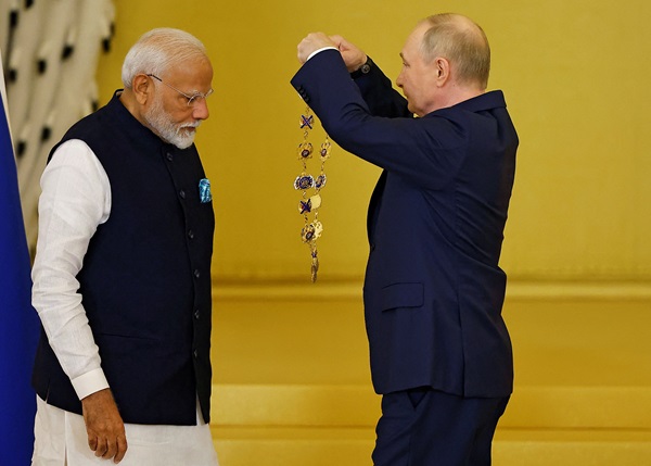 모디에 러시아 최고 훈장 수여하는 푸틴