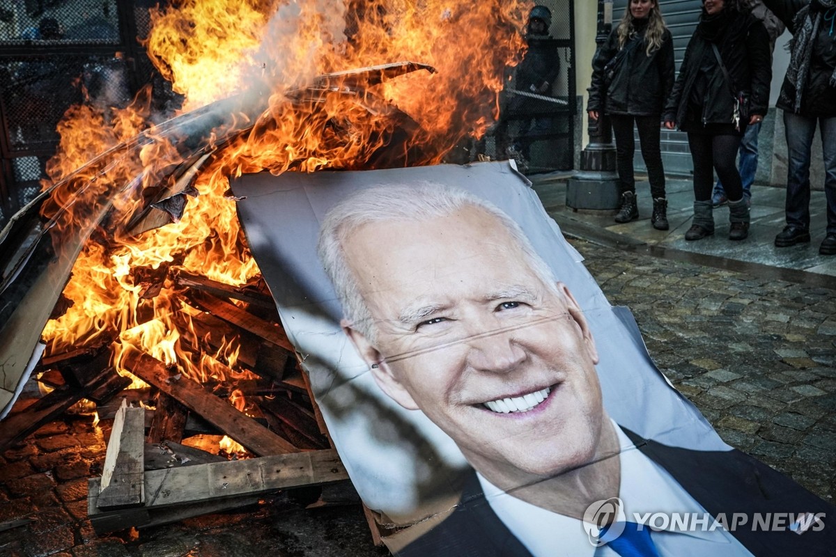 주요 7개국(G7) 에너지·환경장관 회의가 열린 이탈리아 토리노에서 환경 운동가들이 조 바이든 미국 대통령의 대형 사진을 불에 태우고 있다. 이들은 토리노와 프랑스 리옹 사이를 잇는 고속철도