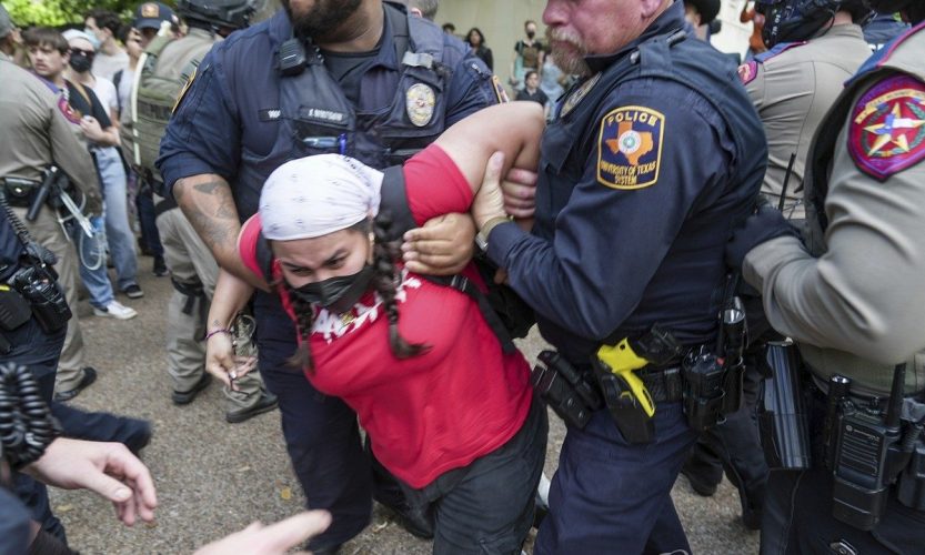 텍사스주 오스틴의 텍사스대 캠퍼스에서 팔레스타인 지지 시위를 벌이던 여성이 경찰에 연행되고 있다. 아이비리그에서 시작된 대학가의 친팔레스타인 시위는 미국 전역으로 확산하는 추세다 0 0