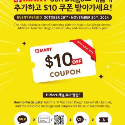 H 마트가 샌디에고 카카오톡 채널 통합 기념 이벤트를 개최합니다. 이번 이벤트는 10월 28일부터 11월 30일까지 약 한 달간 진행되며, H 마트 샌디에고 카카오톡 채널을 추가하는