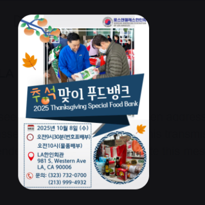 LA한인회가 올 추석에 어려운 한인가정을 돕고자 오는 10월 8일 쌀, 라면등 한국 식료품을 준비해 푸드뱅크 행사를 실시합니다. 물량에 한정이 있어 선착순 300명에게 물품을 배부할 예정입니다.