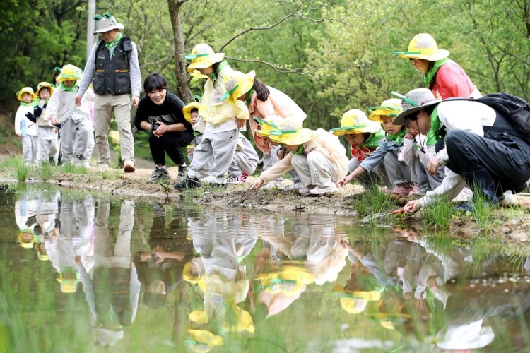 지구의날인 4월 22일 광주 북구 평두메습지에 어린이 습지 탐사에 참가한 어린아이들이 개구리와 올챙이등 습지생물들을 관찰하고 있는 모습 연합뉴스 0 0