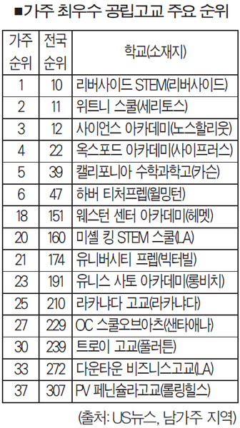 US 뉴스&월드리포트(이하 US뉴스)가 선정해 발표한 미국 최우수 공립 고등학교 순위에서 남가주 지역 고교들이 캘리포니아 탑5에 올랐다. 24일 US뉴스가 공개한 2024년 전국 공립고교 순위 자료에 따르면