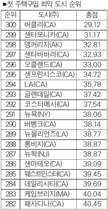 버클리·샌타모니카 ‘최악’ LA도 300개 도시중 294위 미국 전체에서 첫 주택구입자들이 집을 사기가 가장 힘든 도시 10곳 중 8곳이 캘리포니아에 위치하고 있는 것으로 나타났다. LA가 첫