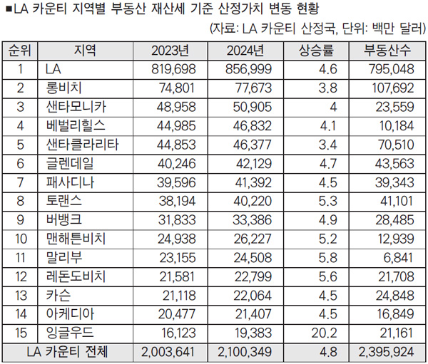 산정국 2024 공시지가 14년 연속 상승 기록 LA 카운티 내 부동산의 공시지가 규모가 지난해 2조 달러를 처음으로 넘어선 가운데, 올해 추가로 5% 가까이 다시 상승하면서