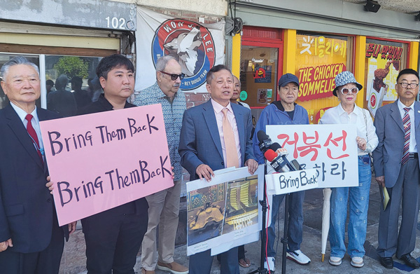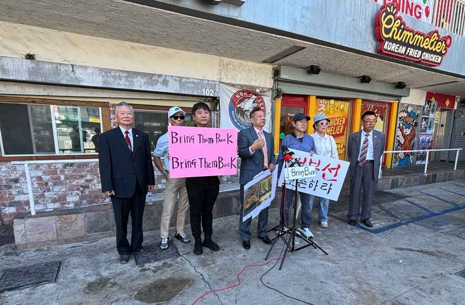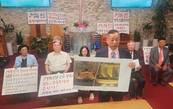 “원래 자리 원상복구해야” “한국문화 알리는데 도움” 22일 ‘거북선 원상복구 추진위원회’ 관계자들이 부산시가 기증한 거북선 모형을 본래 자리로 원상복구해 줄 것을 촉구하고 있다. 지난 42년간 LA시장