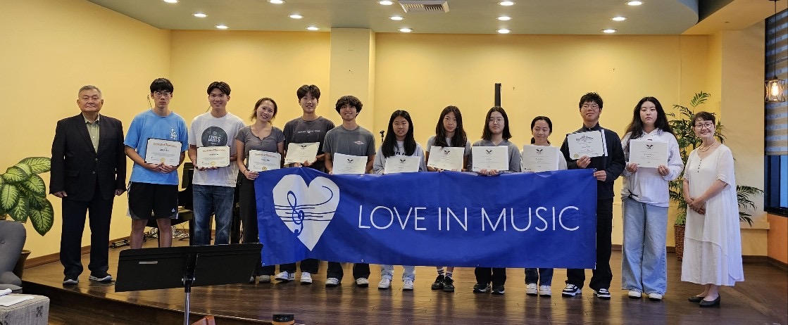 한인 청소년들이 타인종 저소득층 학생들을 대상으로 무료 악기 레슨으로 아름다운 봉사 활동을 펼치는 러브 인 뮤직이 지난 10일 새학기 문을 활짝 열었습니다 이날 러브 인