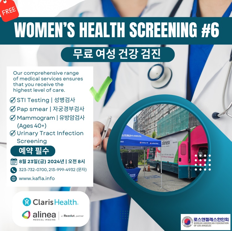엘에이 한인회가 제 6회 여성건강검진을 이번달 23일에 오전 8시에 엘에이 한인회관에서 실시합니다 이번 검사에서는 자궁경부암, 유방암, 요로감염, 각종부인과 질환 상담등 총 7가지 검사를 진행하며 보험여부