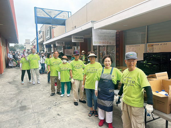 OC한미 시니어 센터(회장 김가등)는 매주 화요일 오전 9시부터 10시까지 무료 푸드를 배급하고 있다. 지난 23일부터 배급 장소를 시니어 센터 뒤쪽 파킹랏에서 앞으로 옮겼다. 자원봉사자들이 자리를