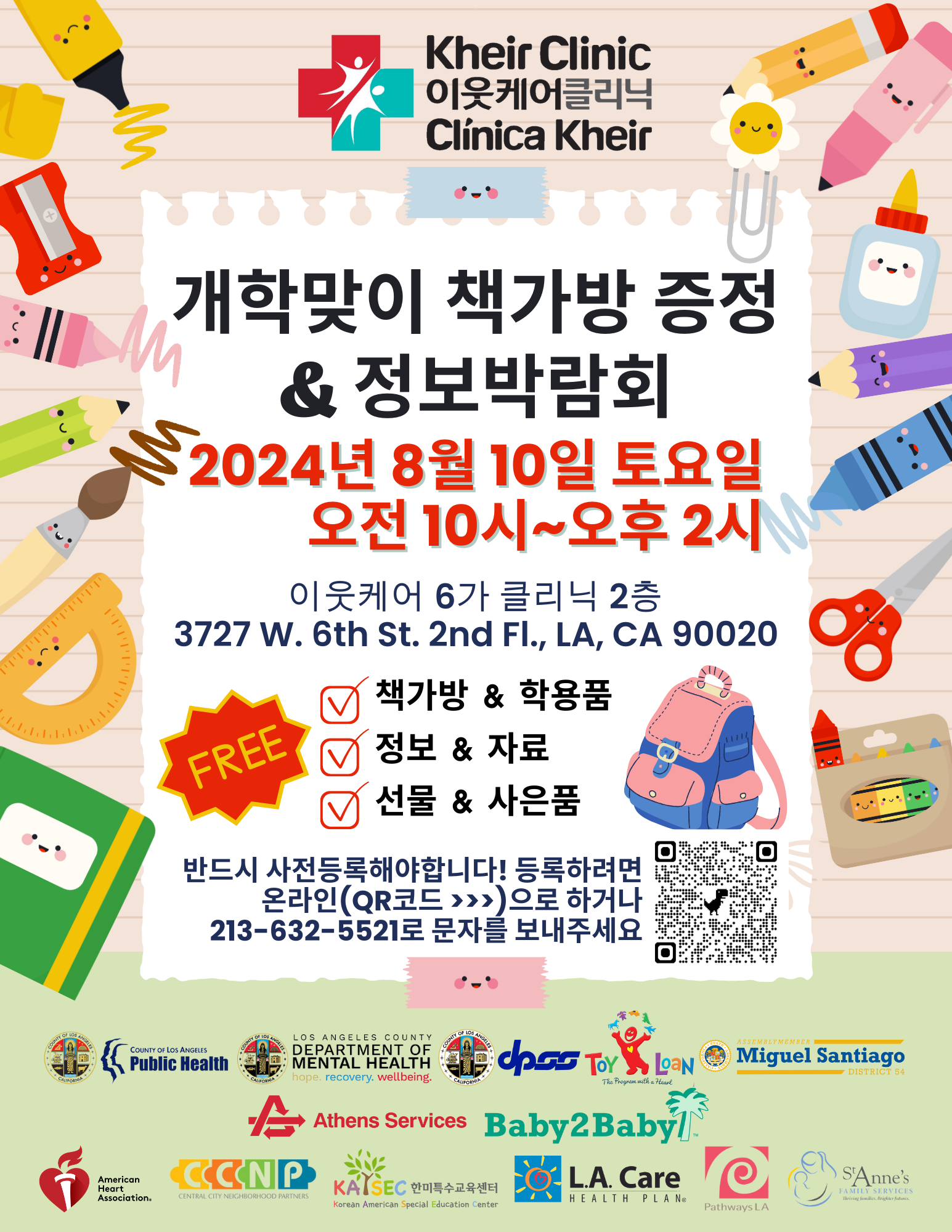 이웃케어 클리닉이 오는 토요일인 10일 6가 클리닉에서 연례 개학맞이 책가방 나눠주기와 정보 박람회를 개최합니다 이번 행사는 무료로 책가방과 학용품을 나눠주는 행사로 10일 오전 10시부터 오후
