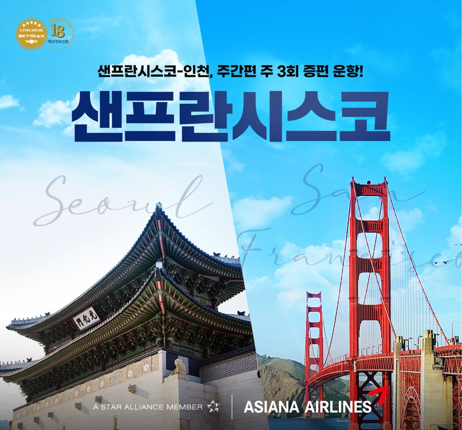 아시아나 항곡측이 5일부터 시작해 오는 23일까지 샌프란 시스코에서 출발하는 인천행 비행편이 증편되는 것을 기념해 특가 이벤트를 진행합니다 특가 이벤트는 올 연말 11월 1일부터 내년 3월