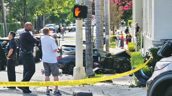 5가와 윌튼 플레이스에서 도주차량 빌딩과 추돌 LA 한인타운에서 경찰의 추격을 받던 강도 용의차량이 한인 여성으로 추정되는 운전자 차량과 충돌 후 아파트 건물을 들이받고 도주하는 사건이