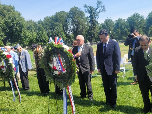 주미대사 “참전용사 헌신이 한국의 자유·평화·번영 기반” 25일(현지시간) 워싱턴 D.C.에서 6·25 전쟁 발발 74주년을 맞아 참전용사와 유가족, 참전국 대표 등이 참석한 가운데 기념행사가 열렸다. 한미 참전용사들과