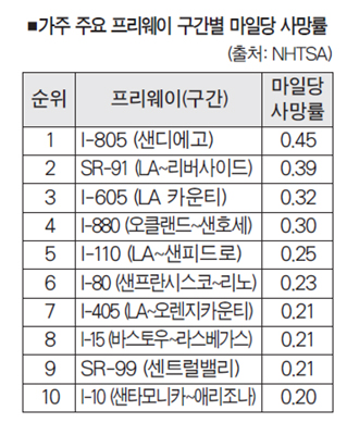 남가주 91번·605번 순 “도심 혼잡·야간 과속 운전자 피로 등 주원인” 캘리포니아의 광활한 도로망은 미국에서 가장 상징적이지만, 그 이면에는 ‘죽음의 도로’라는 오명이 함께한다. 연방 고속도로교통안전청(NHTSA)의